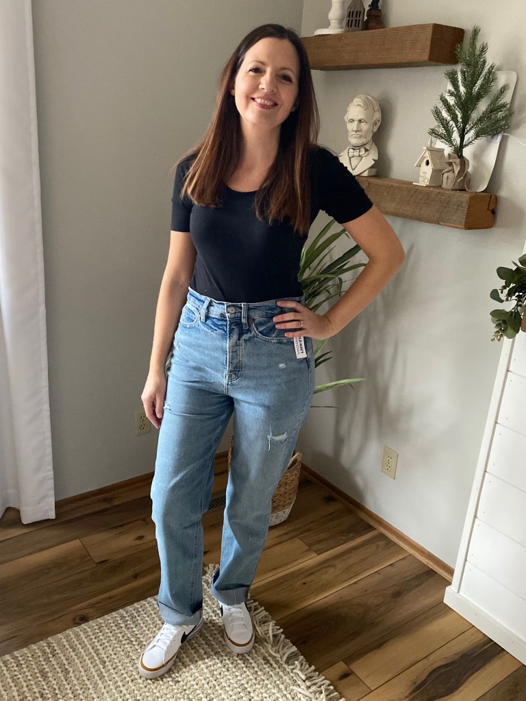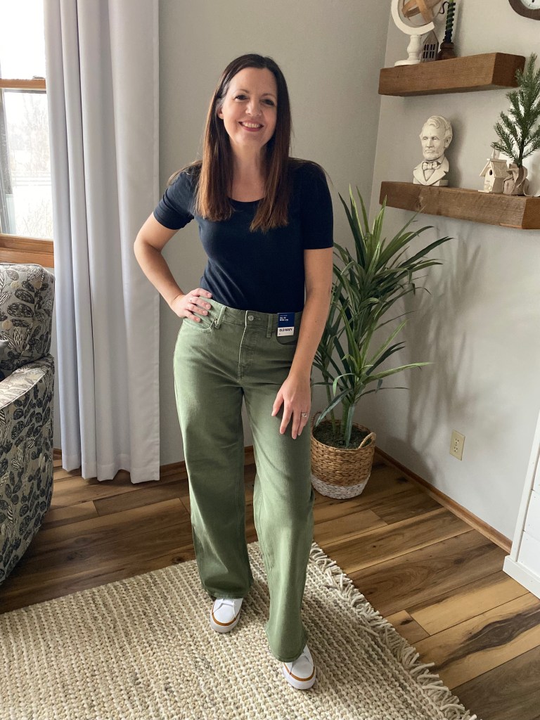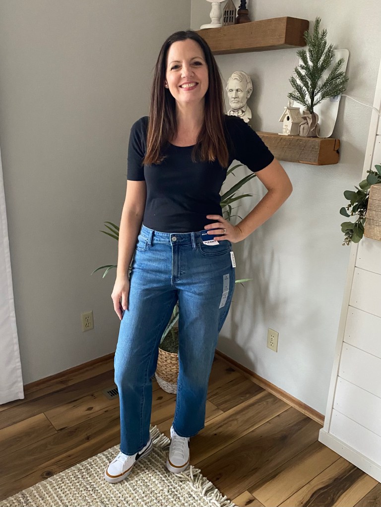 Now it’s hard to tell in this picture, but these are on the shorter side. They hit just above my shoes. I know that’s the style now, but I can’t get it out of my 90’s brain that they’re not “high-waters.” I always had longer legs, so I’ve always struggled getting jeans long enough so they wouldn’t look dorky. So now that it’s the style, it’s taking me awhile to come on board.
