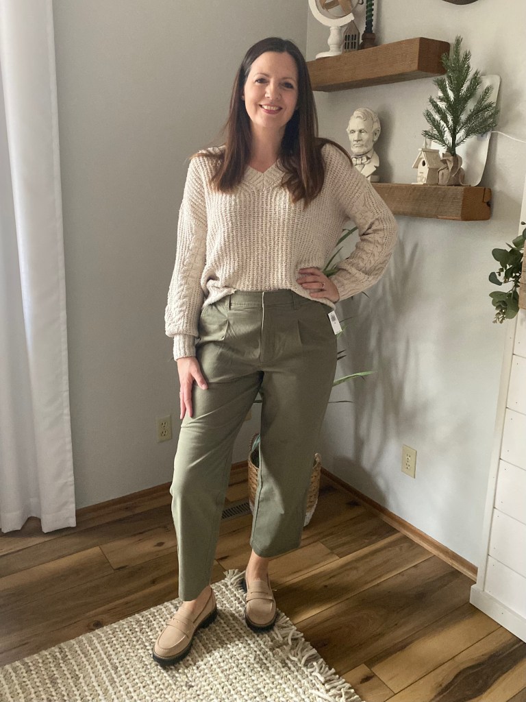 I switched it up here with a beige top because I didn’t have any shoes that looked good with a black top and these pants. I thought my Nikes looked weird with these, and I don’t have any decent black shoes. What do we think about the pleats? I’ve always thought they were unflattering, but I know they’re making a comeback. And the length? These are ankle pants, so obviously they’re supposed to be shorter, but are they too short?