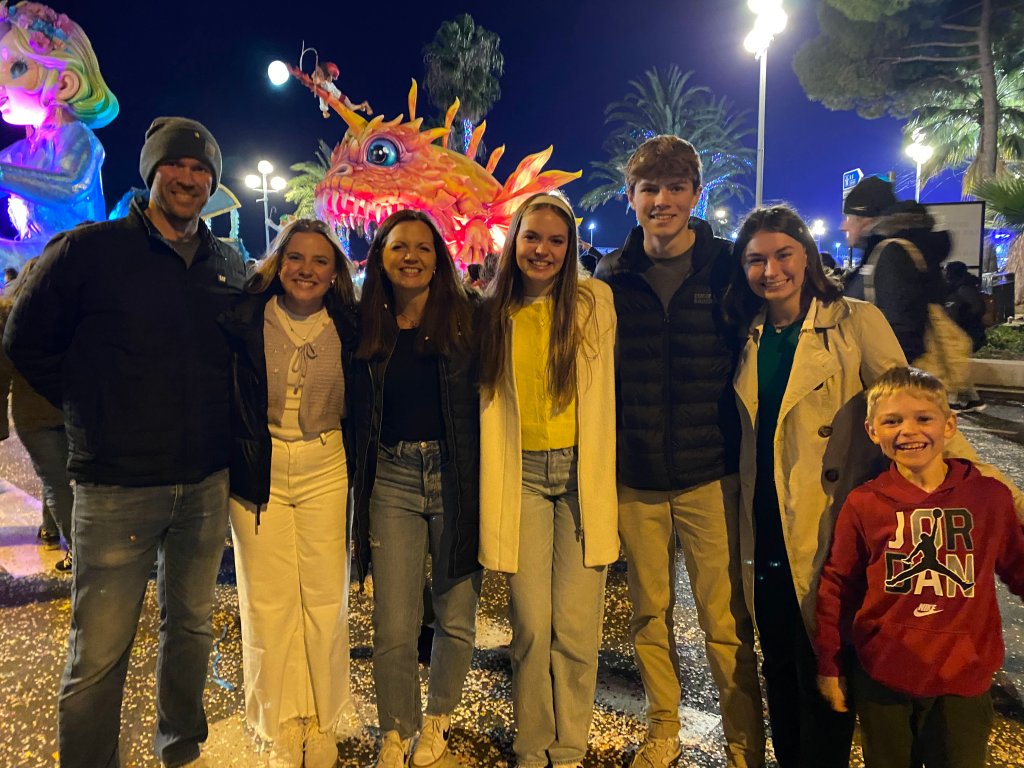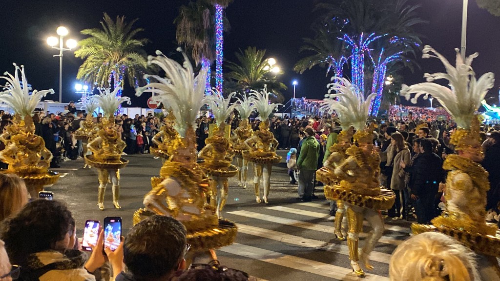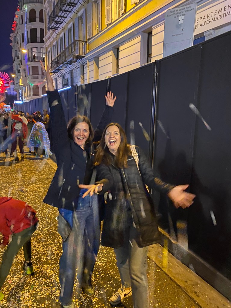 The parade in Nice throws out confetti instead of beads, so we didn’t get to add to our bead collection, but the confetti was super fun too!