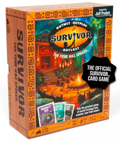 This is a card-based game for up to 6 people. I really hope they make an expansion because I think it would be even more fun with more people. You draw cards with actions or bonuses on them like “raid another player’s camp” (steal a card) or “immunity idol,” which serves like an actual immunity idol during the vote. Then throughout the game there are times when you have Tribal Council, and you vote someone off. However, if you get voted off, you then join the “jury” and get to vote for who you think should win, so you’re not completely out of the game.